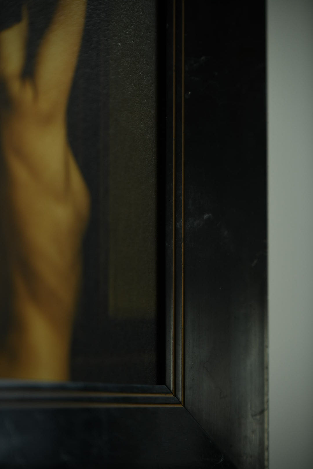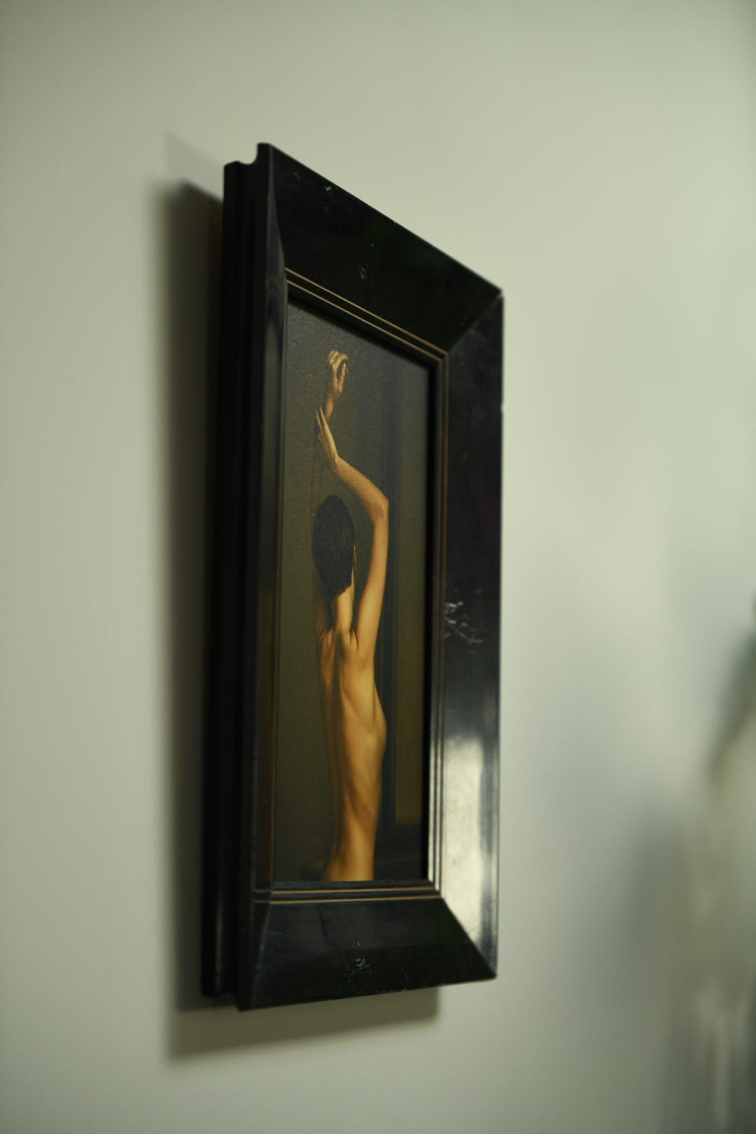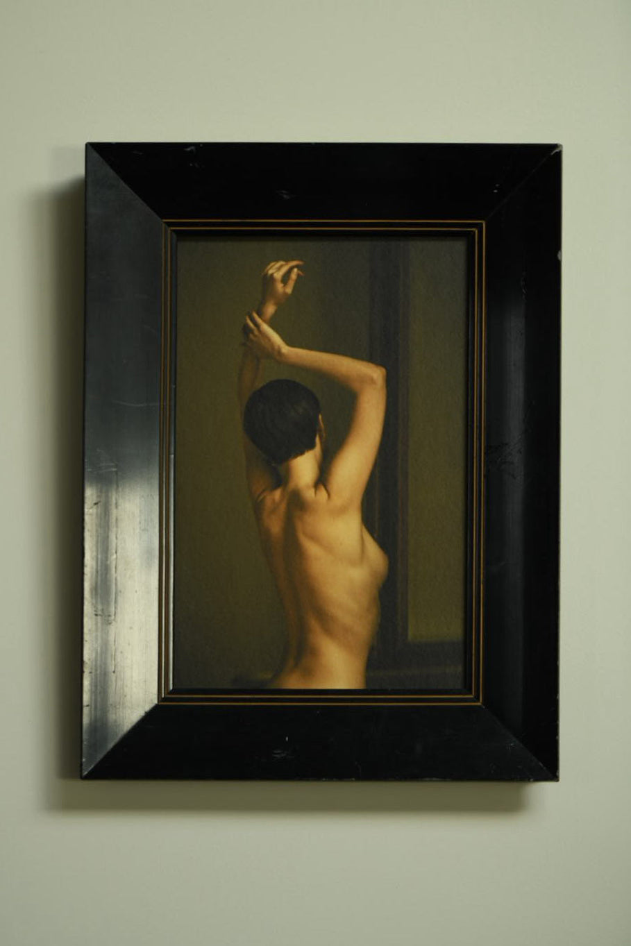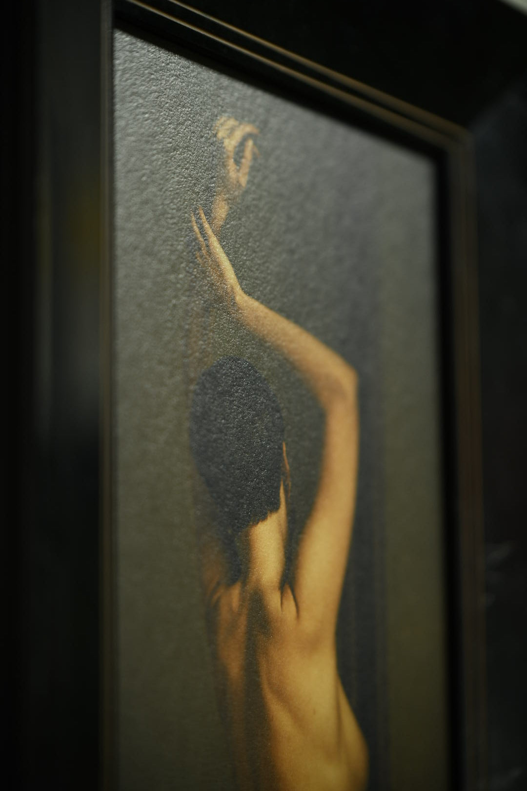 This artwork is presented in a refined, deep black wooden frame with clean beveled edges and a subtle golden inner line. The minimalist yet elegant frame provides a striking contrast to the softness of the photograph, enhancing both its intimacy and its timeless quality. Its dark surface and muted sheen give it a quiet presence, allowing the image to stand forward with strength.