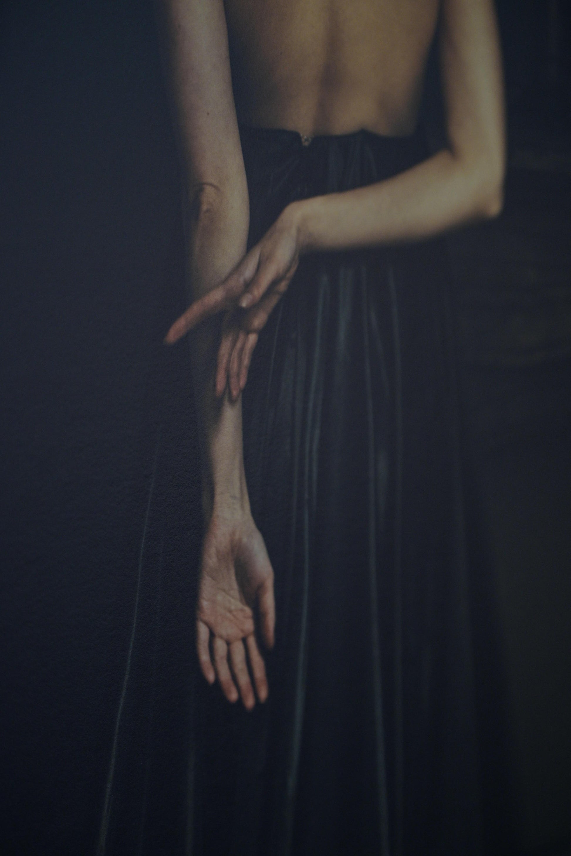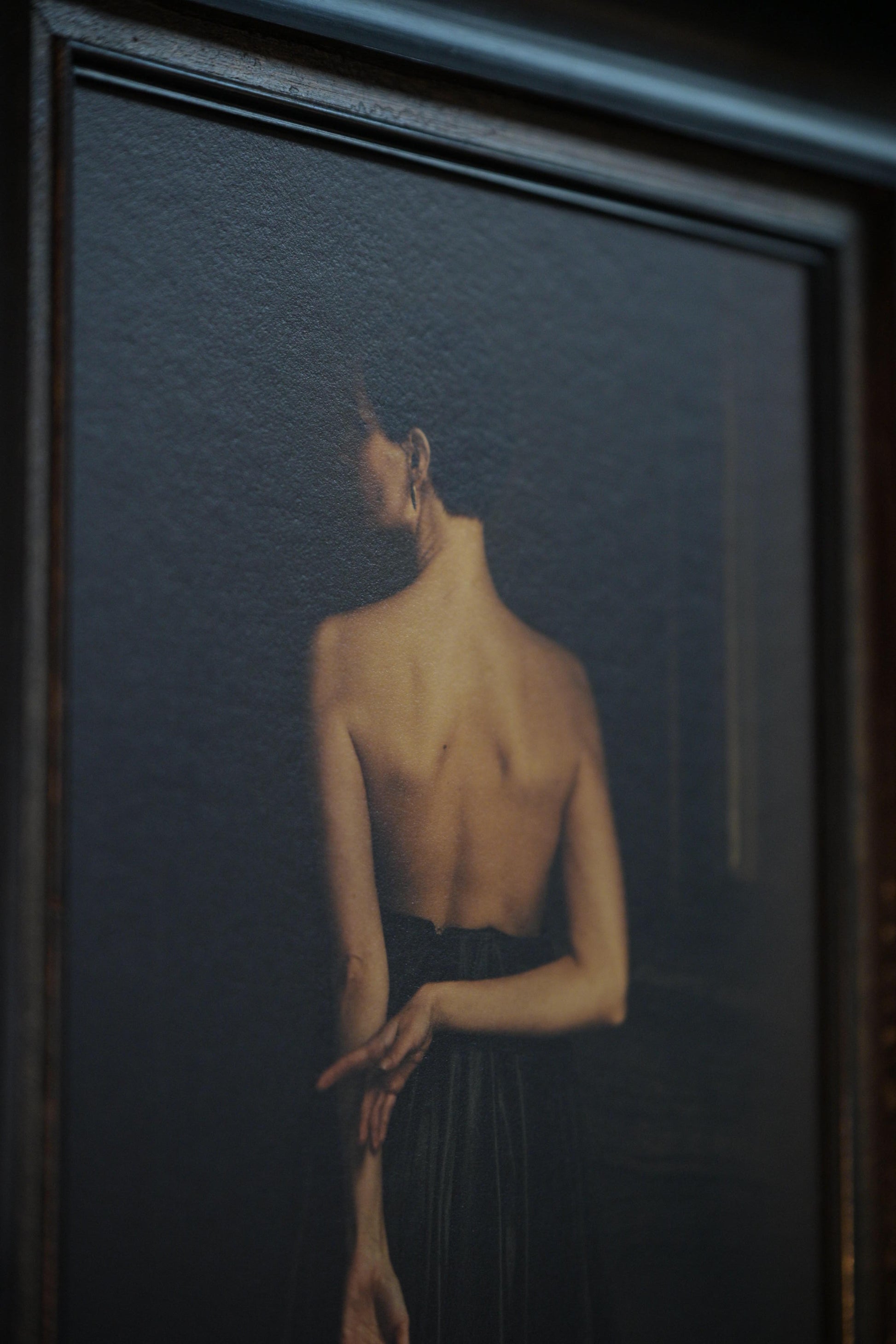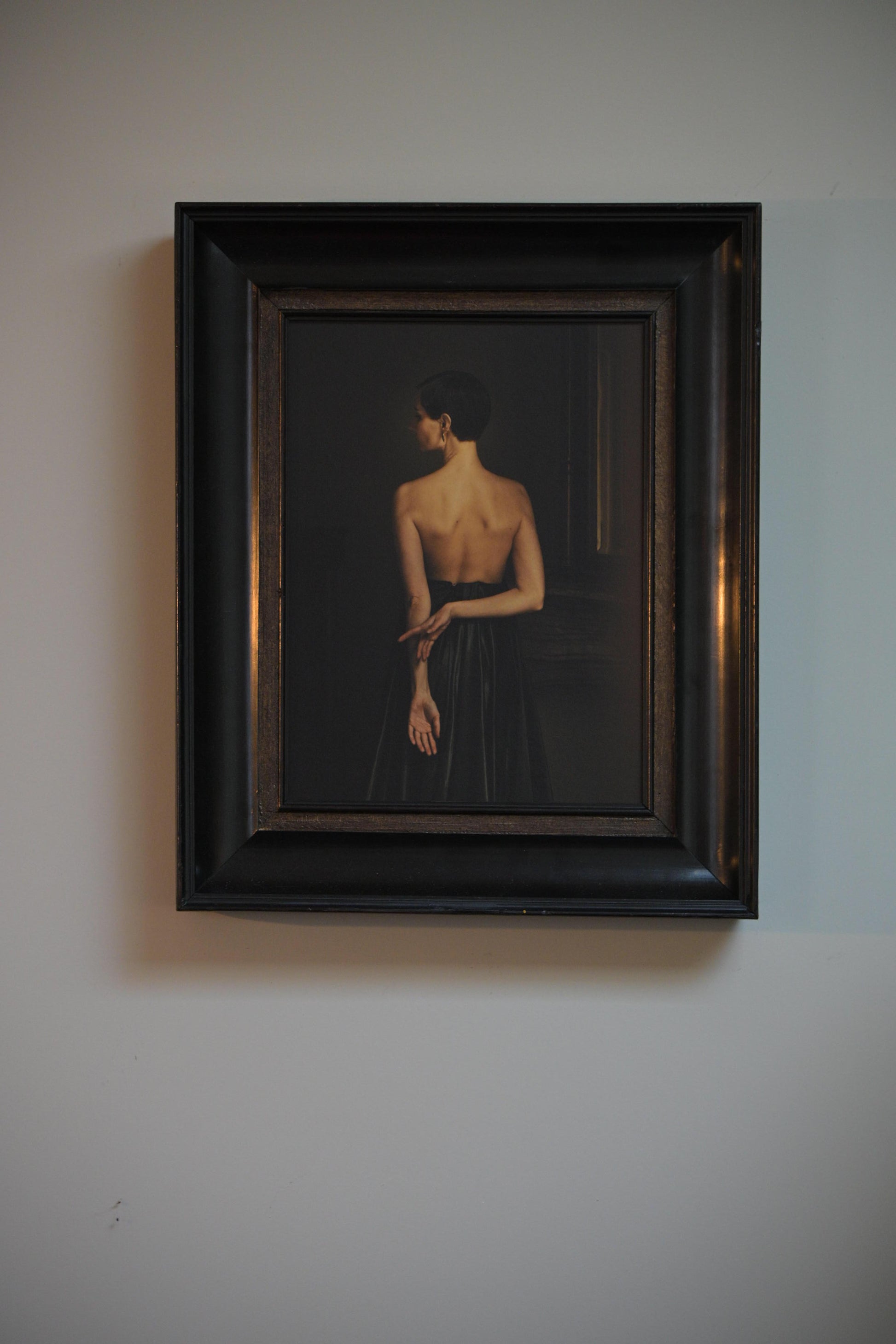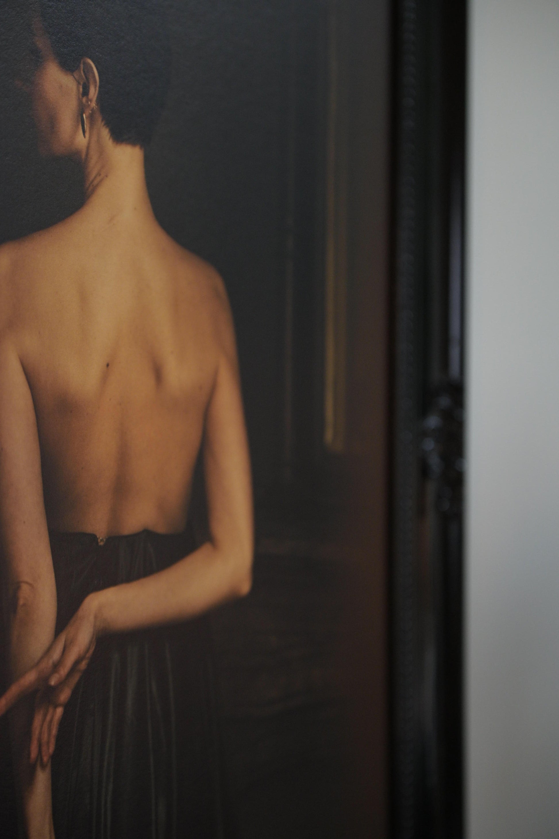 This one of a kind artwork shows a female figure seen from behind, caught in a moment of hesitation. Her bare back is exposed, her posture restrained. One hand reaches back softly, as if pausing a thought, a decision, or a departure. The image holds tension through what is not shown.