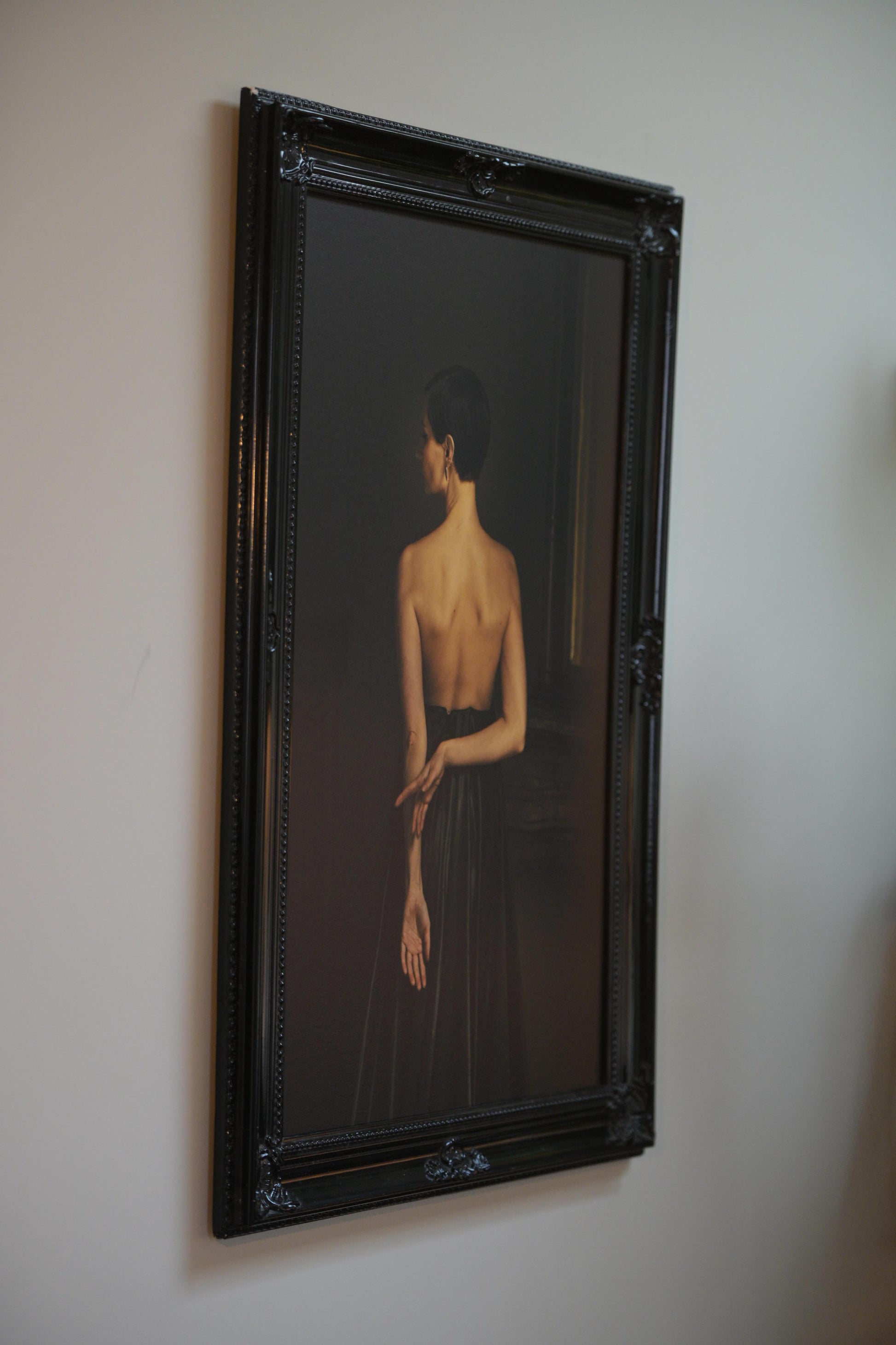 The photographic print measures 50 × 75 cm, presented in a hand-selected vintage black frame and subtle signs of age. The frame functions as a dark threshold, drawing the viewer inward while reinforcing the intimacy of the scene.