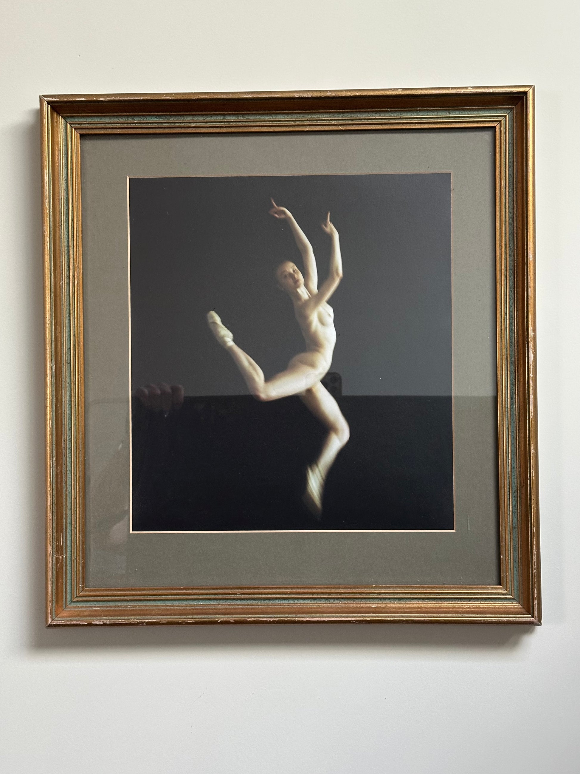 A body suspended in mid-air, fragile yet powerful, caught between freedom and vulnerability. The blur of movement turns the ballet dancer into both presence and ghost, as if she exists only for a fleeting second. Printed on museum-grade Hahnemühle paper and sealed with my wax stamp, this work is set in a hand-picked vintage frame whose patina adds depth and history to the image. A unique piece, only one exists. Size 49x53cm