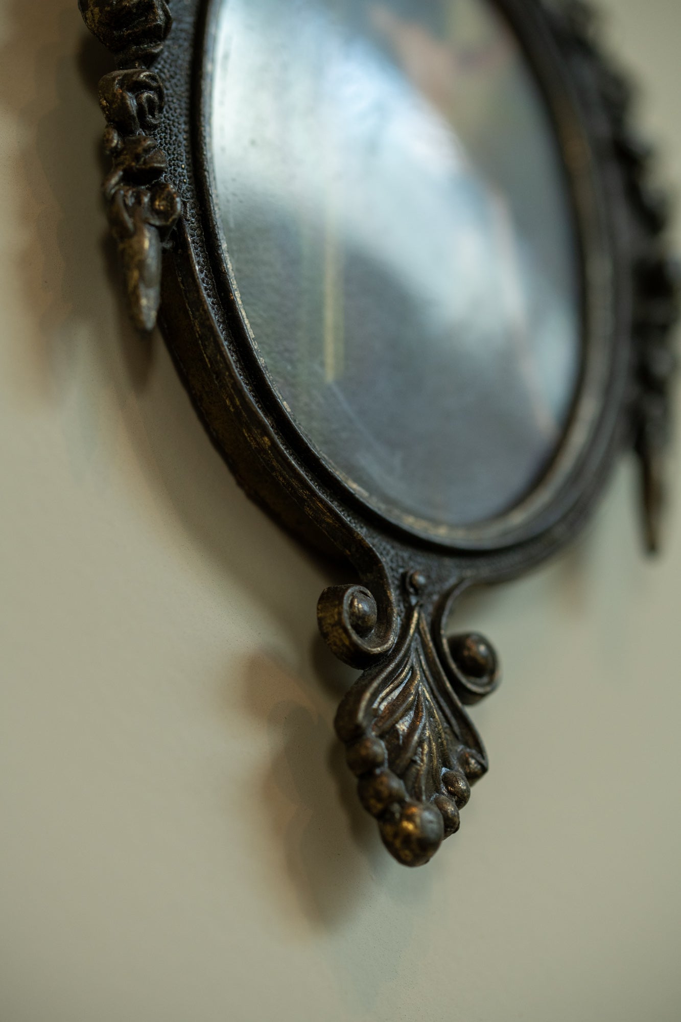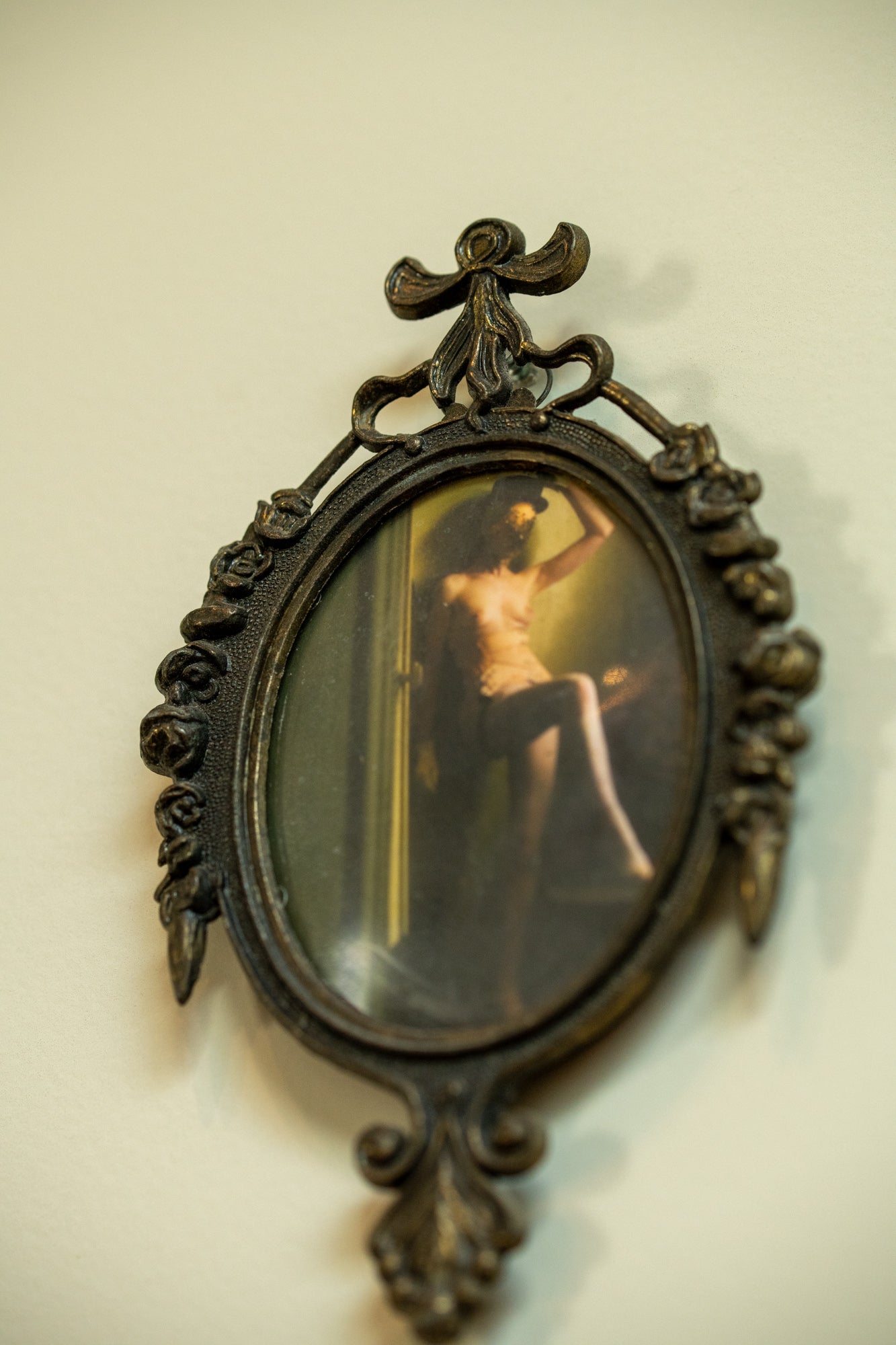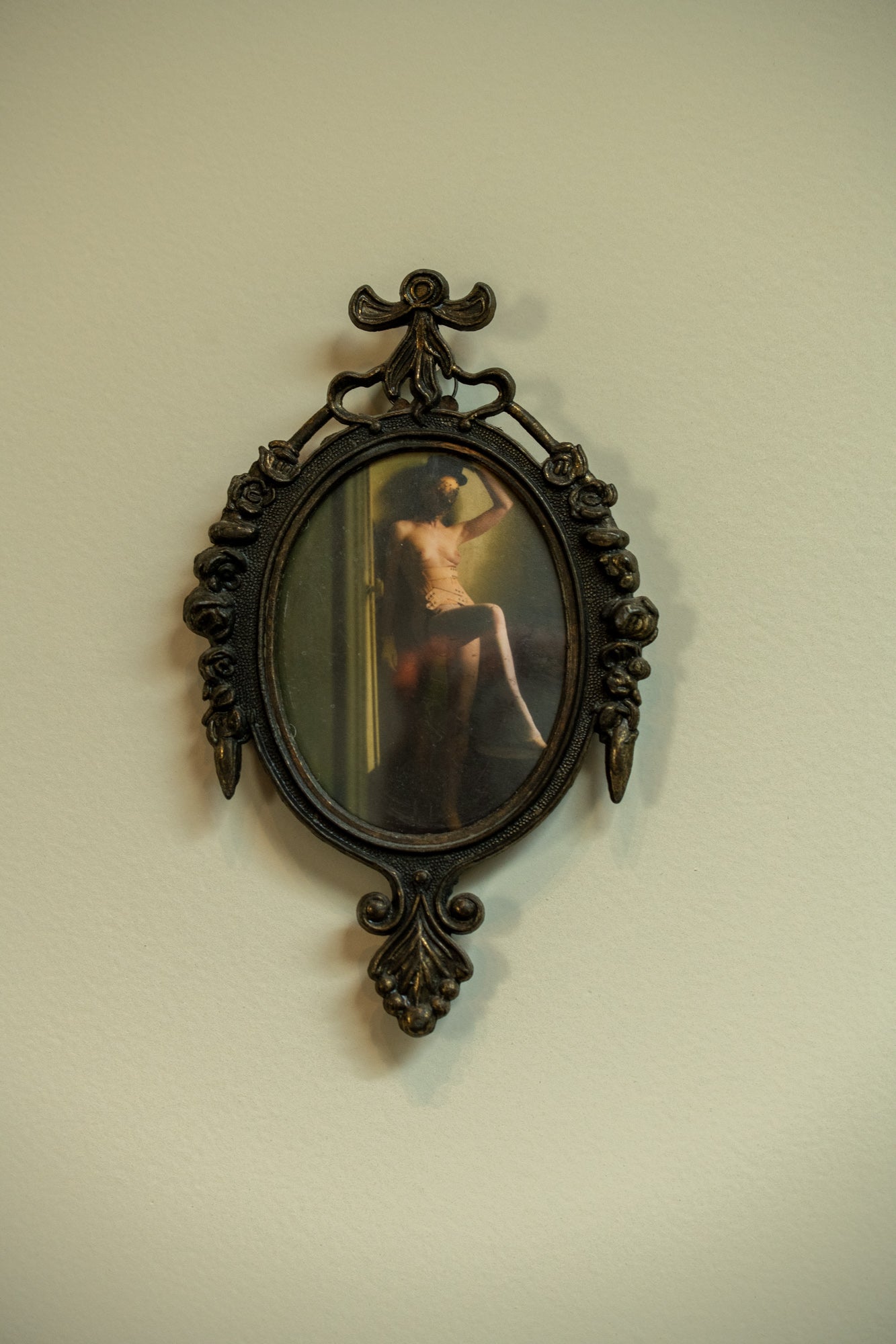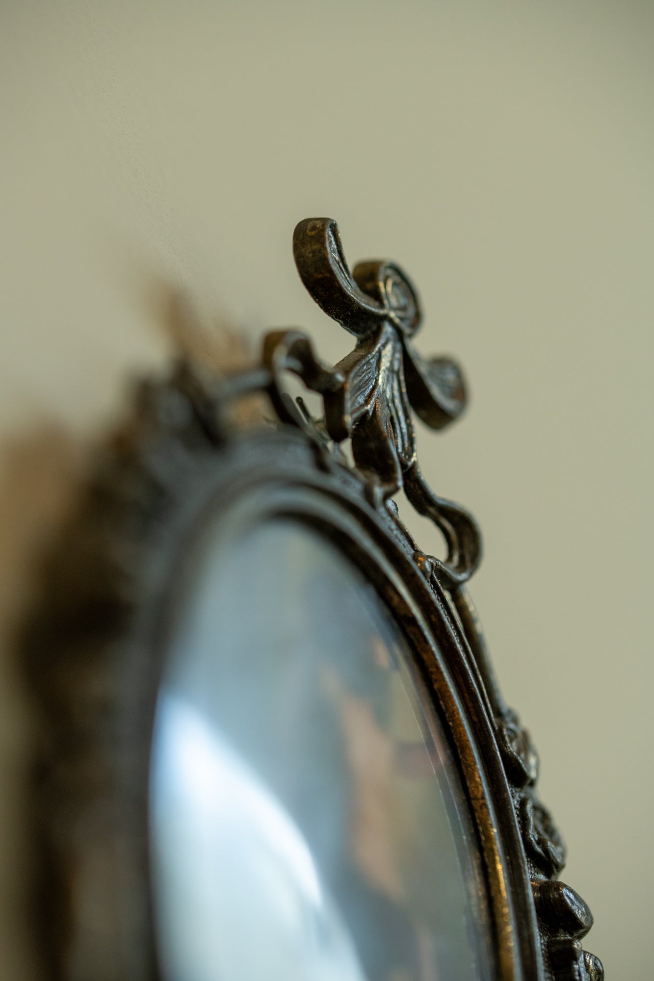 This artwork is presented in an ornate Italian metal frame with an antique bronze finish. The oval shape is surrounded by delicate floral details and a ribbon ornament on top, giving the piece a timeless character. The craftsmanship of the frame brings depth and elegance while the patina shows subtle signs of age that add authenticity.