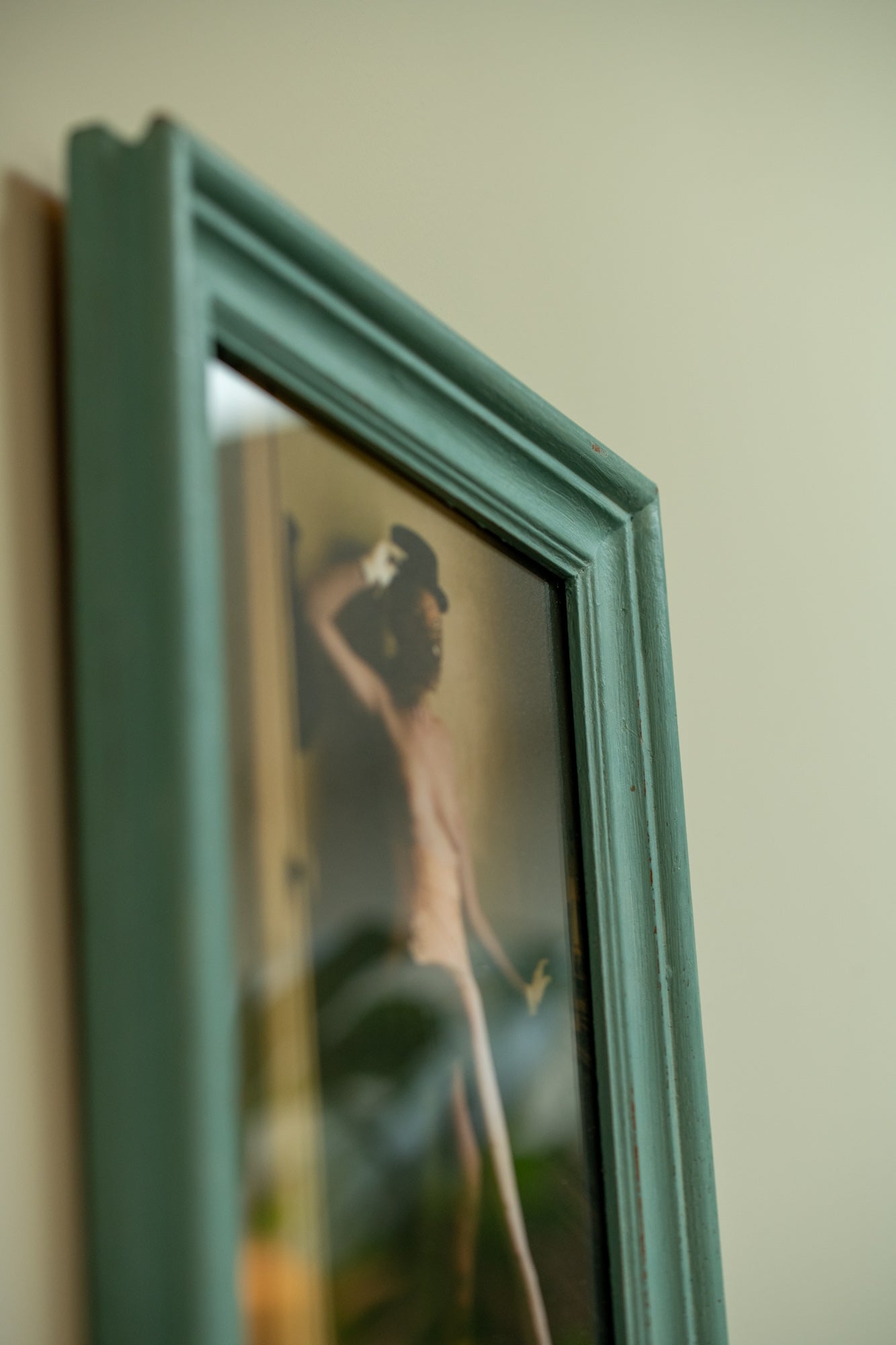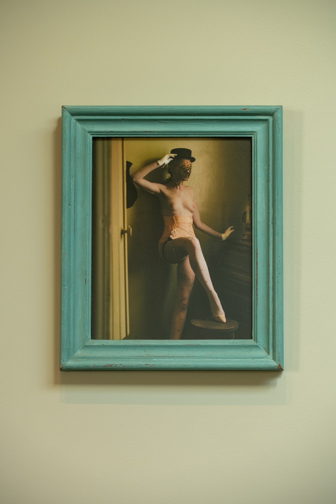 This artwork is presented in a wooden frame with a distressed turquoise finish. The surface shows subtle marks of age and wear, giving it a raw and authentic character. The simplicity of the frame contrasts with the intensity of the image, allowing the photograph to draw all focus while still being held in a strong and distinctive setting.