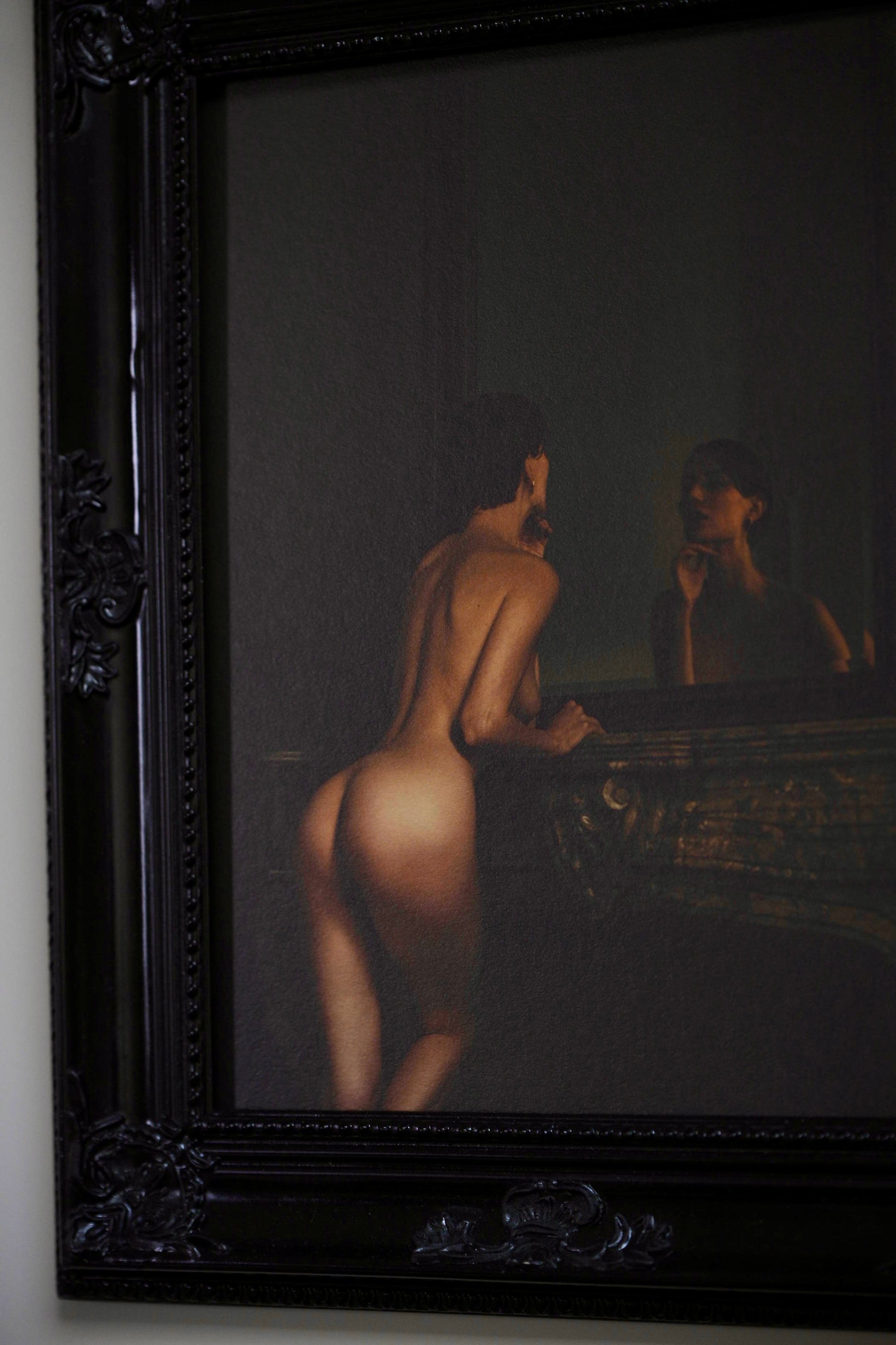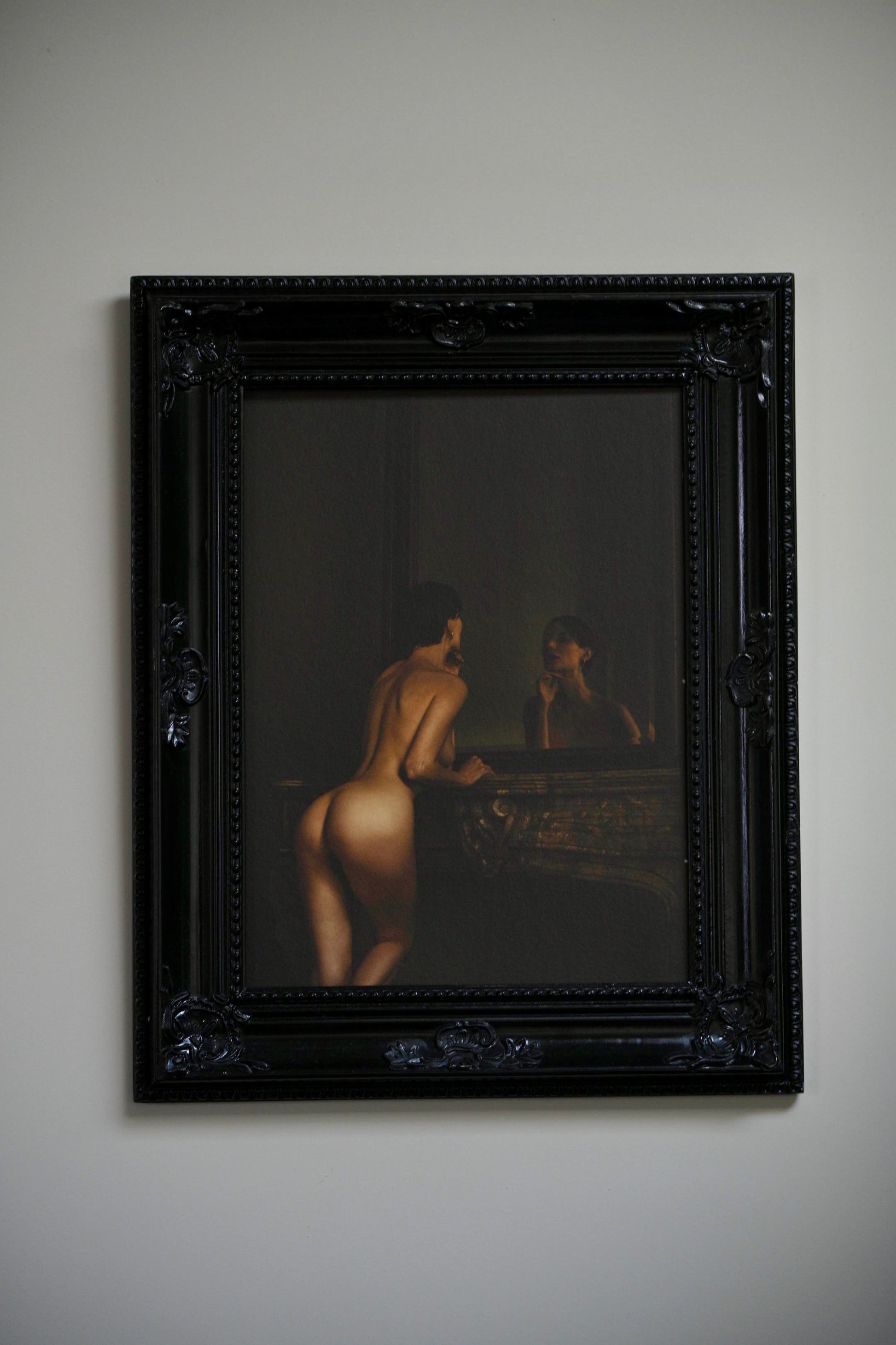 A nude figure leans into the mirror, her body shaped by soft directional light and deep shadow. The reflection creates a doubling effect that feels intimate and introspective, as if the room itself is holding its breath. The atmosphere is sensual without excess, painterly in tone, and rich in dark warmth.